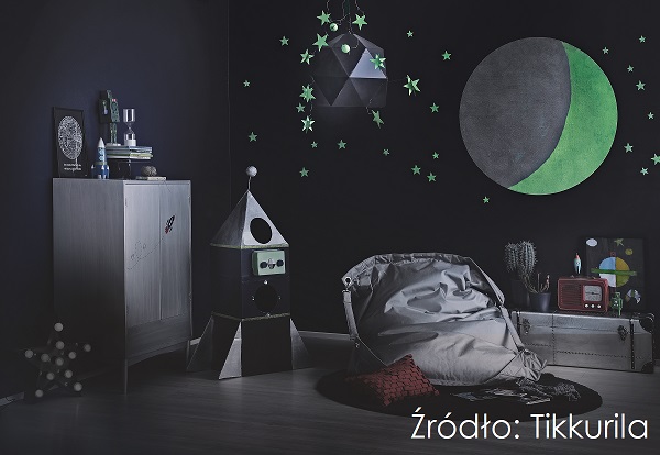 Mali miłośnicy kosmosu, spoglądający z tęsknotą i ciekawością w kierunku rozgwieżdżonego nieba, z pewnością docenią możliwość posiadania własnej galaktyki na ścianie. Można ją z łatwością namalować z użyciem srebrnej farby Tikkurila Taika Pearl Paint. W takim pokoju lot na księżyc wyda się być banalnie łatwy, kiedy tylko za paliwo posłuży dziecięca wyobraźnia. A gdy zgasną światła, prywatne ciała niebieskie nawet przy pochmurnej pogodzie rozbłysną w ciemności, ułatwiając przejście z marzeń do zasłużonego snu. Wystarczy pokryć je dodatkowo fluorescencyjnym laserunkiem Tikkurila Taika Glow, który świeci aż do sześciu godzin.